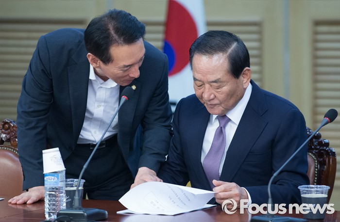 (서울=포커스뉴스) 27일 오후 서울 여의도 국회 의원회관에서 열린 한일의원연맹 간사회 및 총회에 참석한 서청원(오른쪽), 김석기 새누리당 의원이 대화하고 있다.