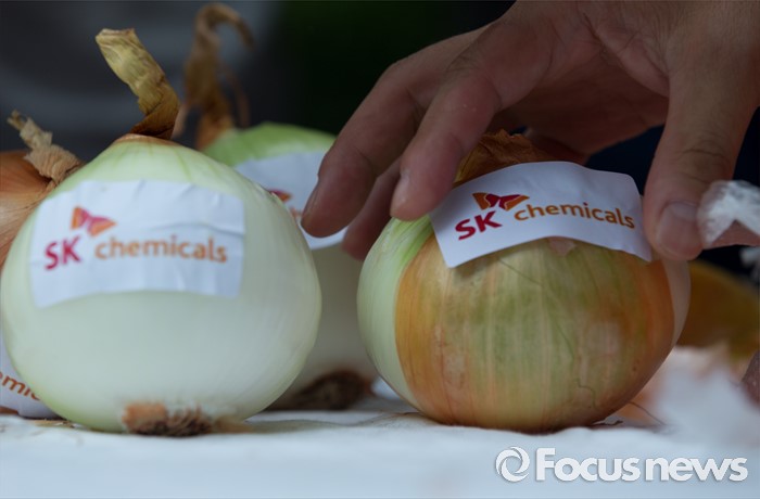 (분당=포커스뉴스) 27일 오후 경기도 성남 분당구 SK케미칼 본사 앞에서 가습기살균제 참사 전국네트워크가 양파 껍질 벗기기 퍼포먼스를 하고 있다.
