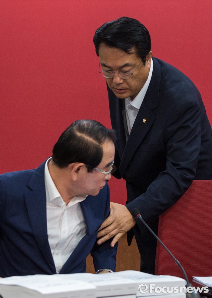 | △ 대화하는 정진석 원내대표-박명재 사무총장 |