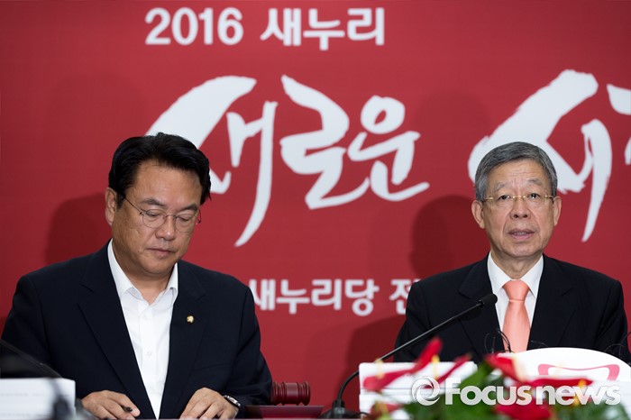 (서울=포커스뉴스) 김희옥(오른쪽) 새누리당 혁신비상대책위원장이 28일 오전 서울 여의도 새누리당사에서 열린 혁신비상대책위원회의에 참석해 모두발언 하고 있다.