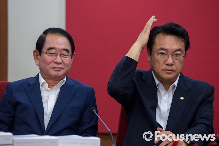 (서울=포커스뉴스) 정진석(오른쪽) 새누리당 원내대표와 박명재 사무총장이 28일 오전 서울 여의도 새누리당사에서 열린 혁신비상대책위원회의에 참석하고 있다.