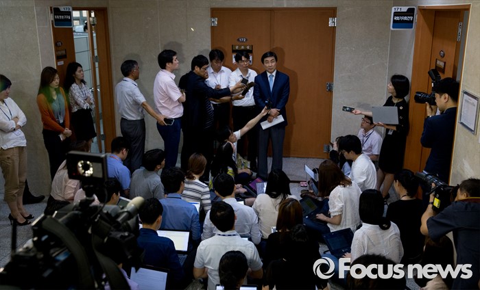 (서울=포커스뉴스) 이종걸 더불어민주당 의원이 28일 오전 서울 여의도 국회에서 전당대회 당대표 출마 기자회견을 마친 뒤 취재진 질문에 답하고 있다.