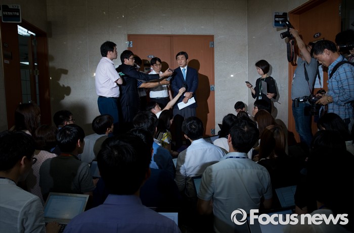 (서울=포커스뉴스) 이종걸 더불어민주당 의원이 28일 오전 서울 여의도 국회에서 전당대회 당대표 출마 기자회견을 마친 뒤 취재진 질문에 답하고 있다.