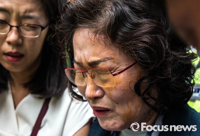 | △ 재단 출범 반대하는 활동가가 뿌린 캡사이신 맞은 김태현 이사장 |