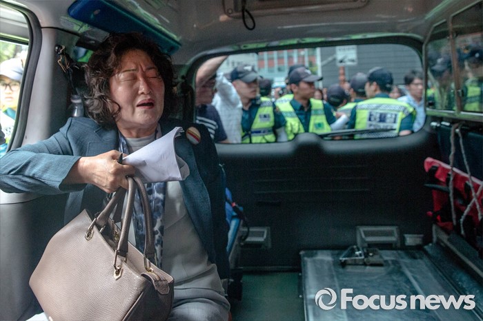 | △ 캡사이신 맞고 구급차에 오른 김태현 이사장 |
