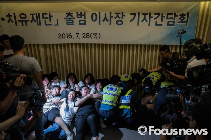 (서울=포커스뉴스) '화해·치유 재단'이 공식 출범한 28일 오전 서울 중구에 위치한 한 건물에서 열린 재단 출범 이사장 기자간담회장에서 재단 출범에 반대하는 대학생들이 회견장을 점거, 농성을 벌이고 있다.