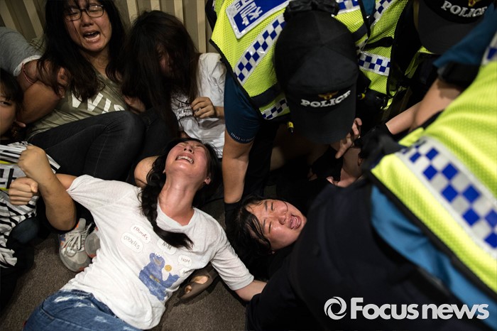 (서울=포커스뉴스) '화해·치유 재단'이 공식 출범한 28일 오전 서울 중구에 위치한 한 건물에서 열린 재단 출범 이사장 기자간담회장에서 재단 출범에 반대하는 대학생들이 회견장을 점거, 농성을 벌이고 있다.