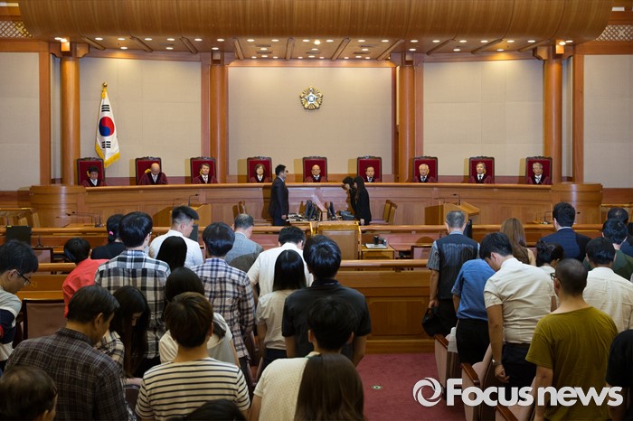 (서울=포커스뉴스) 박한철(가운데) 헌법재판소장과 법관들이 김영란법 위헌 여부 판결을 위해 28일 오후 서울 종로구 헌법재판소 대심판정에 착석해 있다.