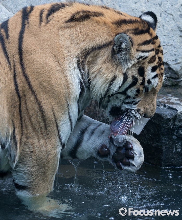 (과천=포커스뉴스) 28일 오후 경기도 과천 서울동물원에서 시베리아 호랑이가 얼린 닭고기를 먹으며 더위를 식히고 있다.