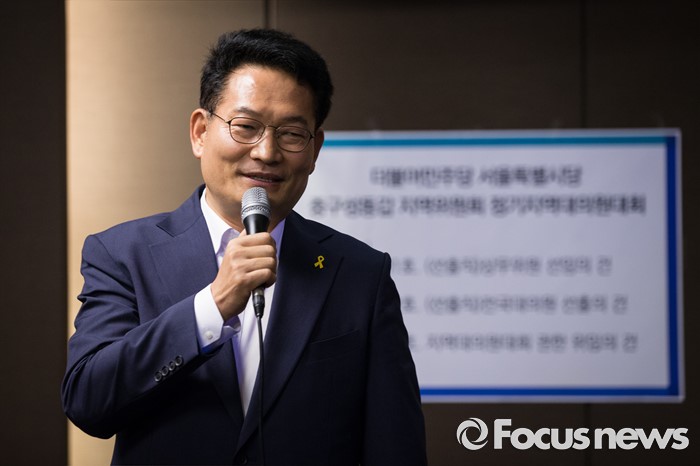 (서울=포커스뉴스) 더불어민주당 송영길 의원이 28일 오후 서울 성동구 레노스블랑쉬 웨딩홀에서 열린 서울 중구·성동갑 지역대의원대회에서 발언하고 있다.