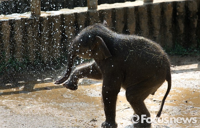 (과천=포커스뉴스) 28일 오후 경기도 과천 서울동물원에서 아기 코끼리가 물줄기를 맞으며 더위를 식히고 있다.
