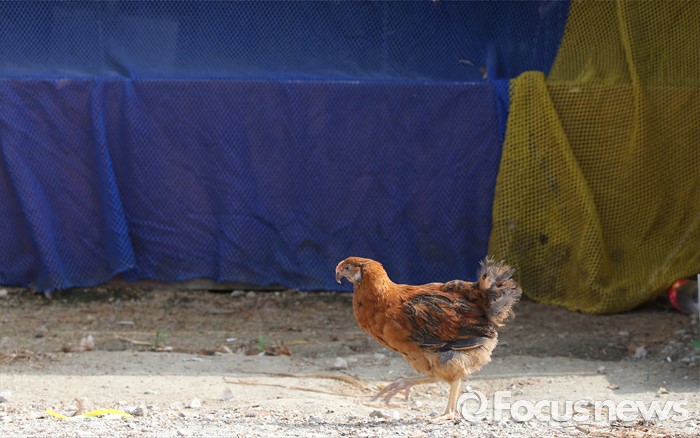 (괴산=포커스뉴스) 폭염으로 가축 폐사가 늘고 있는 가운데 28일 오후 충북 괴산의 양계농가에서 양계장을 탈출한 닭이 지나고 있다.