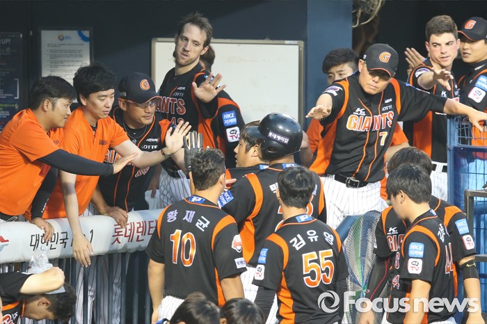 (서울=포커스뉴스) 28일 오후 서울 잠실구장에서 열린 2016 타이어뱅크 KBO리그 롯데-LG 경기에서 4회초 4번타자 롯데 최준석이 홈런을 친 뒤 동료의 축하를 받고있다.