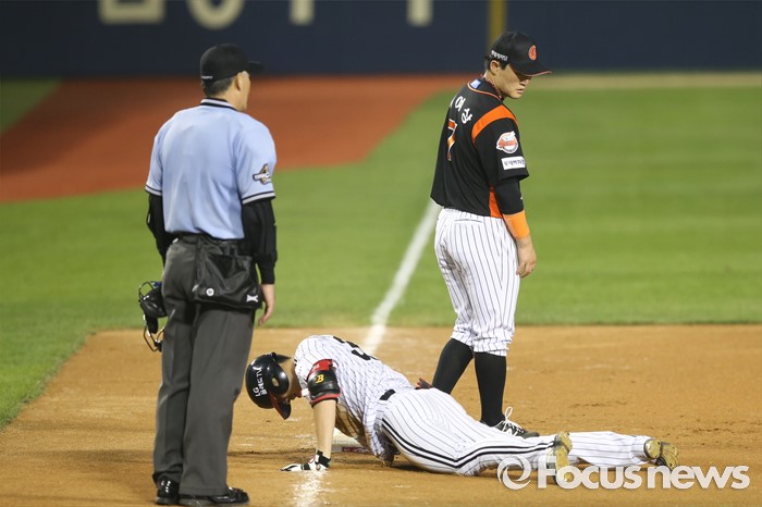 (서울=포커스뉴스) 28일 오후 서울 잠실구장에서 열린 2016 타이어뱅크 KBO리그 롯데-LG 경기에서 6회말 LG 이형종이 3루타를 치고 3루로 슬라이딩하고 있다.