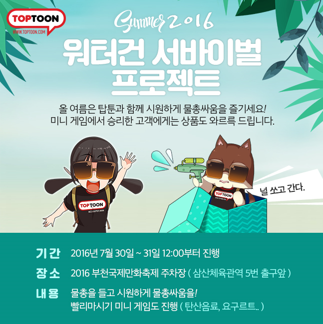 (서울=포커스뉴스) 탑코믹스에서 운영하고 있는 웹툰 전문 플랫폼 탑툰은 '2016 부천국제만화축제'에서 부대행사 중 하나인 '워터건 서바이벌'을 진행한다고 28일 밝혔다.