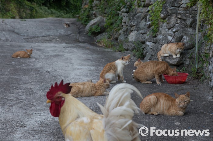 (여서도=포커스뉴스) 고양이 천국 여서도 돌담길목에서 수탉이 길가에 늘어진 길냥이들을 보고 있다.