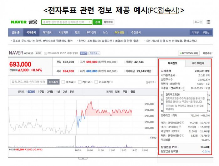 이에 따라 주주들은 네이버에서 상장기업의 시가총액 등 투자정보와 주주총회 일자·전자투표 도입 정보를 확인할 수 있다.