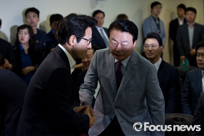 (서울=포커스뉴스) 정병국(왼쪽) 새누리당 의원과 한선교 의원이 9일 오전 서울 여의도 새누리당사에서 열린 '4차 전당대회 혁신과 화합의 선거 서약식'에 참석해 악수 하고 있다.