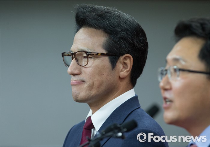 (서울=포커스뉴스) 전당대회 대표최고위원 출마를 선언한 정병국(왼쪽), 김용태 새누리당 의원이 29일 오후 서울 여의도 당사에서 단일화 발표 기자회견을 하고 있다. 이날 두 의원은 여론조사를 통해 정병국 의원으로 단일화를 결정했다.