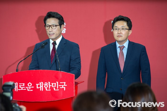 (서울=포커스뉴스) 새누리당 전당대회 대표최고위원 출마를 선언한 정병국(왼쪽), 김용태 의원이 29일 오후 서울 여의도 당사에서 단일화 발표 기자회견을 하고 있다. 이날 두 의원은 여론조사를 통해 정병국 의원으로 단일화를 결정했다.