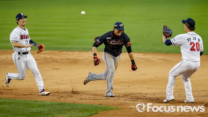 (서울=포커스뉴스) 26일 서울 잠실구장에서 열린 2016 프로야구 한화-두산 경기에서 2회초 한화 신성현이 런다운에 걸려 귀루하고 있다.