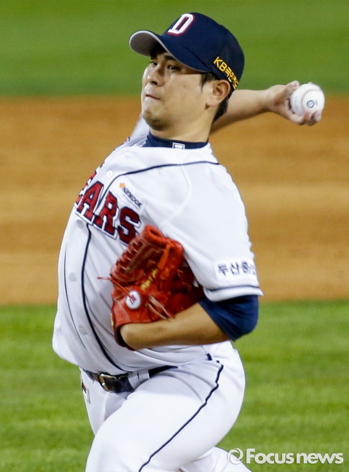 (서울=포커스뉴스) 26일 서울 잠실구장에서 열린 2016 프로야구 한화-두산 경기에서 5회초 투수 윤명준이 투구하고 있다.