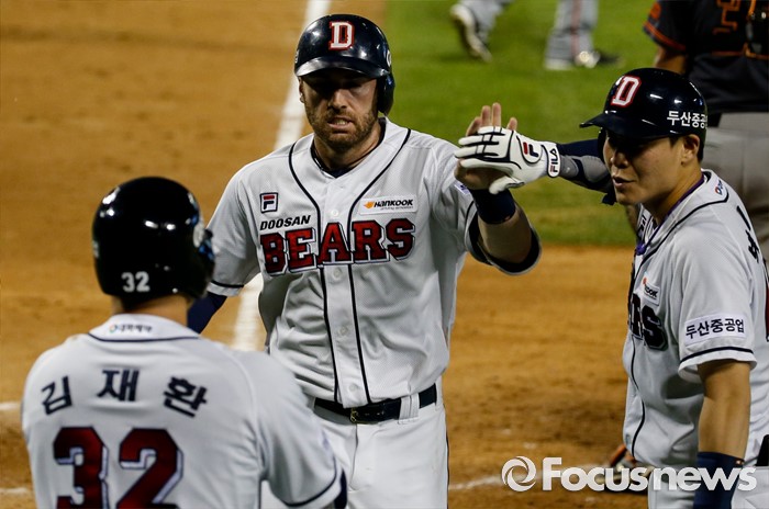 (서울=포커스뉴스) 26일 서울 잠실구장에서 열린 2016 프로야구 한화-두산 경기 5회말 1사 만루 상황에서 두산 에반스가 허경민의 2타점 역전 적시타로 홈을 밟고 있다.