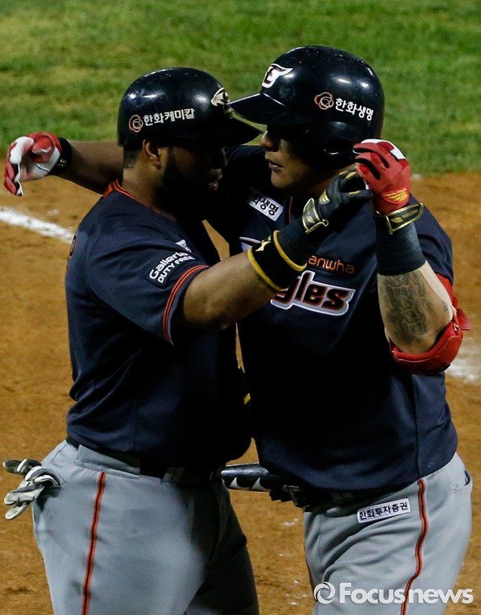 (서울=포커스뉴스) 26일 서울 잠실구장에서 열린 2016 프로야구 한화-두산 경기 7회초 2사 1,2루 상황에서 3점 홈런을 친 후 로사리오와 포옹하고 있다.
