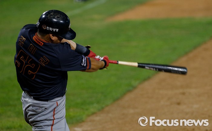 (서울=포커스뉴스) 26일 서울 잠실구장에서 열린 2016 프로야구 한화-두산 경기 9회초 2사 1루 상황에서 한화 김태균이 1타점 2루타를 치고 있다.