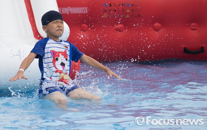 (서울=포커스뉴스) 30일 오전 서울 마포구 망원한강공원 수영장을 찾은 시민들이 물놀이를 즐기고 있다.
