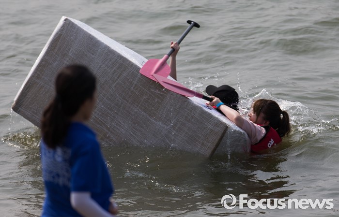 (서울=포커스뉴스) 30일 오후 서울 송파구 잠실한강공원에서 열린 한강 종이배 경주대회 '박스원레이스'에 참가한 시민들이 탄 배가 침몰하고 있다.