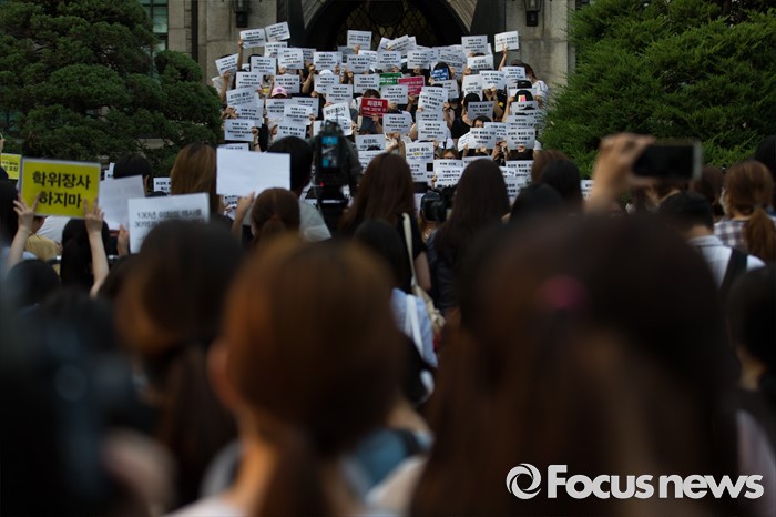 (서울=포커스뉴스) 30일 오후 서울 서대문구 이화여자대학교 본관 앞에서 고졸 출신 직장인 등을 위한 단과대 설립을 반대하는 학생들이 경찰의 폭력 진압 의혹 기자회견을 하고 있다. 이날 오후 경찰은 학교 측 요청으로 갇혀 있던 교수, 교직원을 데리고 나왔으며 이 과정에서 경찰과 재학생 간 충돌이 있었다.