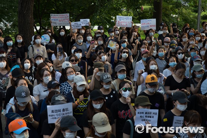 (서울=포커스뉴스) 30일 오후 서울 서대문구 이화여자대학교 본관 앞에서 고졸 출신 직장인 등을 위한 단과대 설립을 반대하는 학생들이 경찰의 폭력 진압 의혹 기자회견을 하고 있다. 이날 오후 경찰은 학교 측 요청으로 갇혀 있던 교수, 교직원을 데리고 나왔으며 이 과정에서 경찰과 재학생 간 충돌이 있었다.