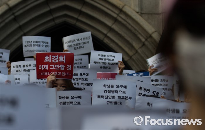 (서울=포커스뉴스) 30일 오후 서울 서대문구 이화여자대학교 본관 앞에서 고졸 출신 직장인 등을 위한 단과대 설립을 반대하는 학생들이 경찰의 폭력 진압 의혹 기자회견을 하고 있다. 이날 오후 경찰은 학교 측 요청으로 갇혀 있던 교수, 교직원을 데리고 나왔으며 이 과정에서 경찰과 재학생 간 충돌이 있었다.
