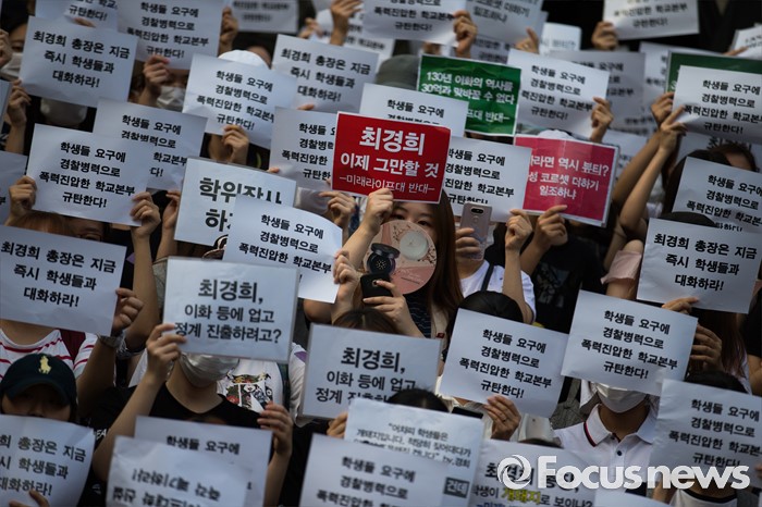 (서울=포커스뉴스) 30일 오후 서울 서대문구 이화여자대학교 본관 앞에서 고졸 출신 직장인 등을 위한 단과대 설립을 반대하는 학생들이 경찰의 폭력 진압 의혹 기자회견을 하고 있다. 이날 오후 경찰은 학교 측 요청으로 갇혀 있던 교수, 교직원을 데리고 나왔으며 이 과정에서 경찰과 재학생 간 충돌이 있었다.