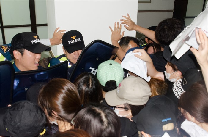 (서울=포커스뉴스) 30일 오후 서울 서대문구 이화여대 본관에서 경찰들이 고졸 출신 직장인 등을 위한 단과대 설립을 반대하는 학생들과 충돌하고 있다. <사진제공=이대학보사>