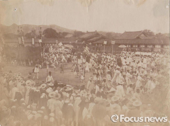 (서울=포커스뉴스) 1897년 11월 21일 명성황후의 장례행렬이 운종가(종로)를 지나고 있고 멀리 북악산의 오른쪽 자락이 보인다. 상복을 입은 남녀 주민들이 비운의 죽음을 당한 황후의 넋을 기리고 있다. 이 사진은 도티가 찍은 사진으로 새디가 1904년 웰본선교사에게 자신의 사진과 함께 선물한 것이다. <사진제공=프리실라 에비>