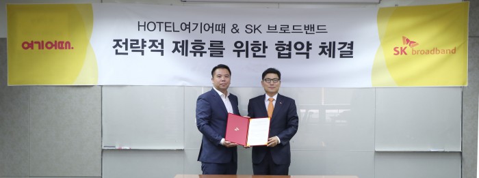 이번 MOU는 SK브로드밴드가 'HOTEL여기어때'에 지능형 영상분석 CCTV(폐쇄회로TV) '클라우드캠'을 비롯 비즈광랜과 기업용 인터넷전화, UHD IPTV 등 서비스를 공급하는 것이 골자다. 'HOTEL여기어때'를 통해 SK브로드밴드의 첨단 인터넷 기반 기술이 보급되는 셈.