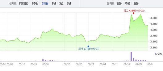 초록뱀은 1일 오전 9시51분 현재 전 거래일 대비 0.95%(40원) 상승한 4230원에 거래되고 있다. 초록뱀은 7월25일에서 27일까지 2~3%의 상승폭을 기록하며 상승 곡선을 그려왔지만 28일 7.95%, 29일 4.77%의 낙폭을 나타냈다.