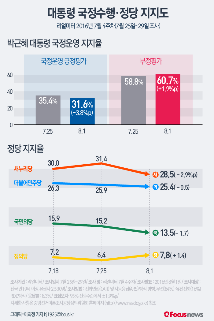 (서울=포커스뉴스) 1일 발표한 여론조사 기관 리얼미터 2016년 7월 4주차 주간집계에 따르면 박근혜 대통령의 국정수행 지지율이 30%대 초반으로 하락했다. 부정평가는 60%대를 넘어섰다. 주요 정당 지지도는 정의당을 제외한 원내 3당의 모두 하락했다.