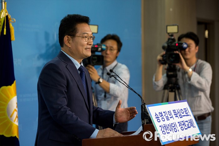 (서울=포커스뉴스) 더불어민주당 전당대회 당대표에 출마한 송영길 더불어민주당 의원이 4일 오전 서울 여의도 국회에서 공약발표 기자회견을 하고 있다.