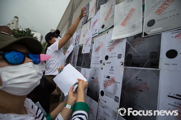 (서울=포커스뉴스) 미래라이프 대학 설립에 반대하는 이화여대 졸업생들 및 재학생들이 2일 오후 서울 서대문구 이화여자대학교 정문 앞에서 졸업장 반납 시위를 하고 있다.