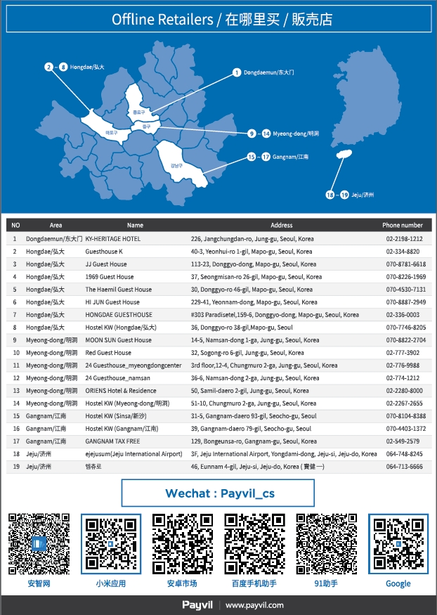 '페이빌'은 중국인 관광객이 한국을 여행하는 데 필요한 모든 기능을 제공하는 것을 목표로 최근 KY헤리티지, 오리엔스호텔 등 호텔과 제휴를 맺는 등 사업을 확장하고 있다. 또 중국인 관광객 숙박이 가장 많은 홍대, 명동, 강남 지역 게스트하우스 20여곳 및 면세점들과도 계약을 체결했다. 제주 지역에서는 제주국제공항 내 판매 매장 및 시내 외국인 쇼핑거리의 매장들과도 제휴 계약을 진행했다.