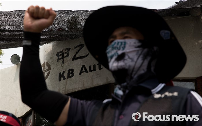 (아산=포커스뉴스) 1일 오후 충남 아산 탕정면 갑을오토텍에서 노조원들이 사측 경비 용역 진입을 반대하며 구호를 외치고 있다.