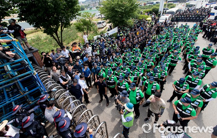 (아산=포커스뉴스) 1일 오후 충남 아산 탕정면 갑을오토텍에서 노조원들과 사측 경비 용역들이 대치하고 있다.