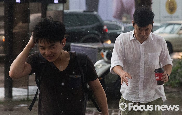 (서울=포커스뉴스) 천둥, 번개를 동반한 강한비가 내린 2일 오후 서울 서초구 교대역 주변에서 시민들이 비를 피해 발걸음을 재촉하고 있다.