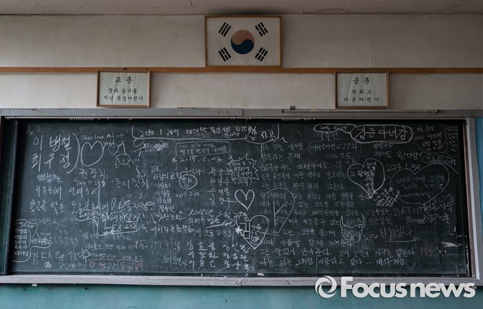 (여서도=포커스뉴스) 폐교된 전남 완도군 여서초등학교 칠판에 관광객들의 낙서로 가득차 있다.