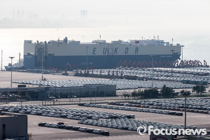 (평택=포커스뉴스) 환경부의 인증취소 및 판매정지 행정처분으로 폭스바겐 코리아가 퇴출수순을 밟고 있는 3일 오후 폭스바겐 차량을 싣고 독일 브레멘하벤에서 출항한 모닝코넬리아호가 경기도 평택항에 도착, 접안되어 있다.