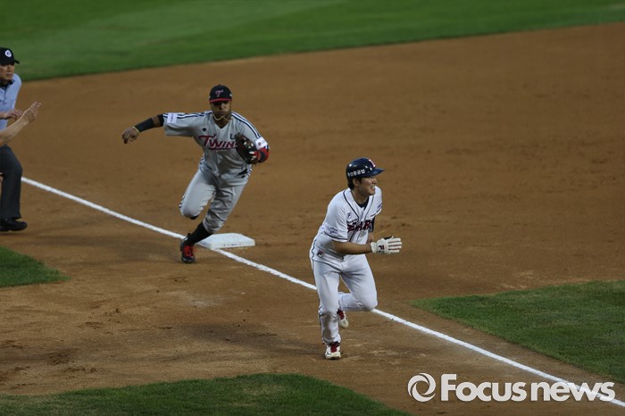 (서울=포커스뉴스) 2일 오후 서울 잠실구장에서 열린 2016 프로야구 LG-두산 경기 3회말 1사 2루 상황, 김재호가 히메네스의 런다운을 피해 홈 베이스로 질주하고 있다.