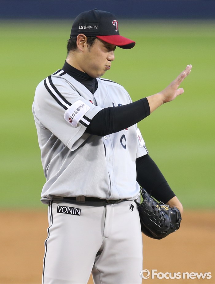 (서울=포커스뉴스) 3일 서울 잠실구장에서 열린 2016 프로야구 LG-두산 경기 2회말 LG 투수 류제국이 두산 1루주자 허경민에게 몸에 맞는 볼에 대해 사과의 제스처를 하고 있다.